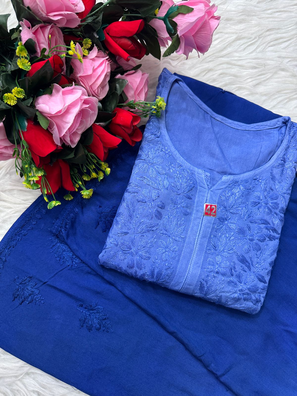 This beautiful kurti and plazo set is crafted from soft ryon fabric, dyed in vibrant shades. The kurti features exquisite Chikan Kari hand embroidery, showcasing delicate floral and geometric designs. Paired with stylish plazos, this set offers a perfect blend of tradition and comfort, making it ideal for festive or casual occasions.
